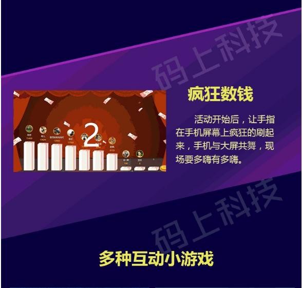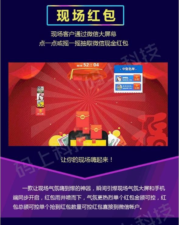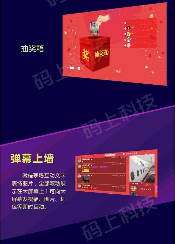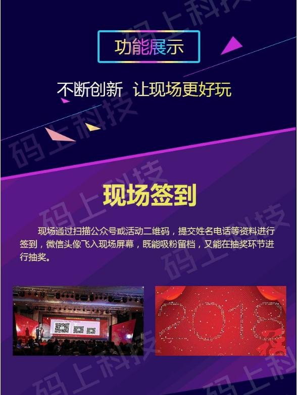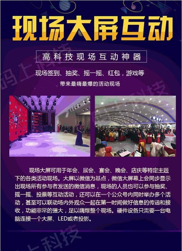 現(xiàn)場大屏可用于年會、展會、宴會、晚會、店慶等特定主題下的各類活動現(xiàn)場。大屏以微信為基點,微信大屏幕上會同步顯示出現(xiàn)場所有參與者發(fā)送的微信消息,現(xiàn)場的人員也可以參與抽獎、搖一搖、投票、游戲等互動活動,還可以在一個公眾號內(nèi)同時舉辦多個活動,甚至可以聯(lián)動場內(nèi)外觀眾一起在第一時間做好信息的傳遞和接收,功能非常的強大,足以嗨爆整個現(xiàn)場。