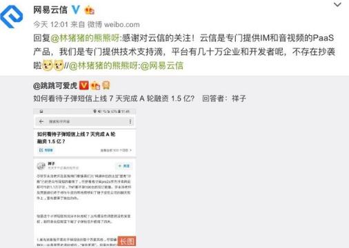 然而網易云信官方微博卻直接表示:“感謝對云信的關注!云信是專門提供IM和音視頻的PaaS產品,我們是專門提供技術支持滴,平臺有幾十萬企業(yè)和開發(fā)者呢,不存在抄襲啦”