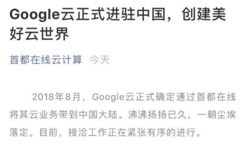 昨日,“首都在線云計(jì)算”公眾號(hào)發(fā)布消息稱,Google 云正式確定通過首都在線將其云業(yè)務(wù)帶到中國大陸,目前接洽工作正在緊張有序的進(jìn)行。按照公眾號(hào)文字內(nèi)容來看,其實(shí)雙方的合作在 8 月就已落地,但遲遲未對(duì)外公布。截至雷鋒網(wǎng)發(fā)稿,該微信文已經(jīng)刪除。