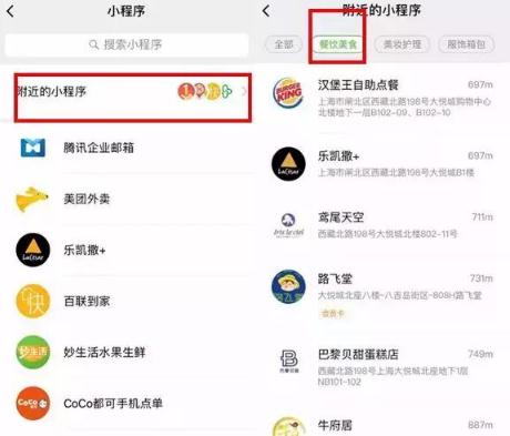 2017年8月,微信官方發(fā)布關(guān)于小程序能力重要升級的消息:為提升用戶使用效率,「附近的小程序」新增餐飲類目篩選。也就是說符合此類目條件的小程序,除了出現(xiàn)在“全部”中,也會在“餐飲美食”里呈現(xiàn)。