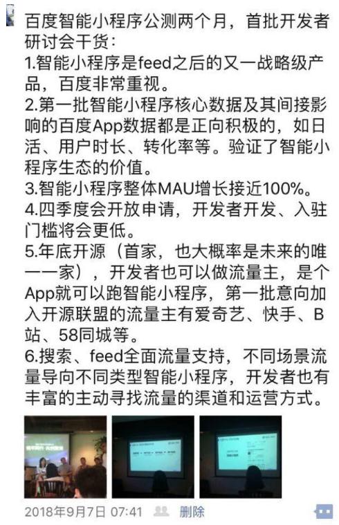 另一面,百度也不甘下風(fēng),在9月6日,百度舉辦了一次關(guān)于百度智能小程序的閉門會議,總經(jīng)理平曉黎在該場閉門會議上,向開發(fā)者透露了百度智能小程序的關(guān)鍵數(shù)據(jù),相關(guān)截圖,討論內(nèi)容也已經(jīng)流出,各項數(shù)據(jù)也均讓人側(cè)目。