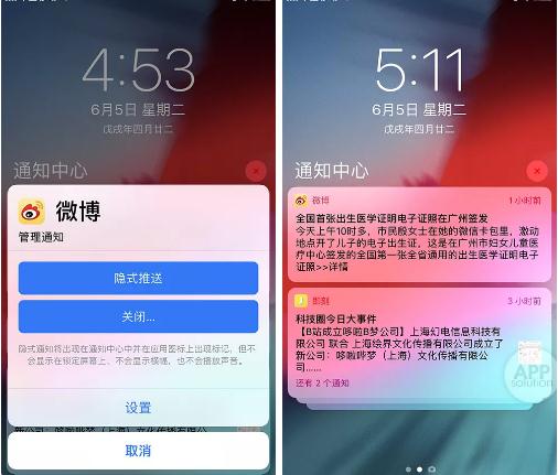 此外,你還可以對(duì)應(yīng)用設(shè)置「隱式推送」,被設(shè)置應(yīng)用的新消息推送將只會(huì)在通知欄上出現(xiàn),雖然會(huì)顯示消息角標(biāo),但不會(huì)出現(xiàn)在鎖屏上,也不會(huì)顯示橫幅或播放聲音。