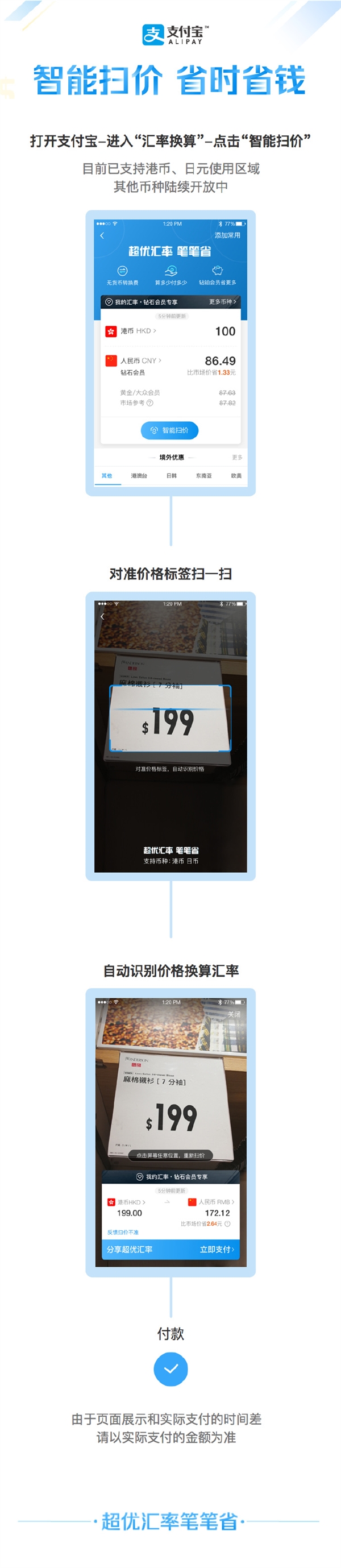 為了方便出境游客,支付寶里新推了“智能掃價(jià)”功能,從支付寶-匯率換算進(jìn)入,打開“智能掃價(jià)”,掃一掃商品價(jià)格標(biāo)簽,就能自動計(jì)算以支付寶付款的價(jià)格結(jié)果。