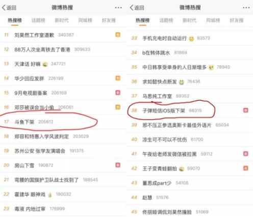 做內(nèi)容的斗魚和做社交的子彈短信,在同一天登上了微博熱搜,竟然都是因?yàn)橄录堋?/p>