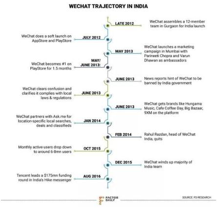 2013年,當(dāng)微信在印度最活躍的時候,有新聞報道稱印度政府計劃封殺微信。一名不愿透露姓名的微信前高管透露,“在謠傳政府將封殺微信之后,微信的衰退就開始了。很多人在這之前甚至都不知道微信是中國的應(yīng)用,他們看到的只是Varun Dhawan和Parineeti Chopra給微信做的宣傳。”