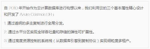 Cosmos DB 提供了一個(gè) NoSQL 數(shù)據(jù)庫(kù)服務(wù),類似于 AWS DynamoDB 和 Google Cloud Datastore。此外,Cosmos DB 是 Azure 的基礎(chǔ)服務(wù),這意味著它可以在所有 Azure 區(qū)域中使用,包括政府、主權(quán)國(guó)家和美國(guó)國(guó)防部等方面的專有云。根據(jù) Azure Cosmos DB 創(chuàng)始人和微軟技術(shù)研究員 Dharma Shukla 的說(shuō)法,Cosmos DB 是作為云原生數(shù)據(jù)庫(kù)服務(wù)而創(chuàng)建的,具有三個(gè)基本特征。