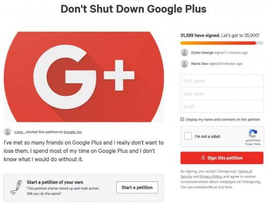 10 月上旬,谷歌官方博客透露公司將在未來 10 個月內(nèi)關閉 Google+ 的消費者版本。公司稱目前 Google+ 的“使用率和參與度都很低”,90% 的 Google+ 用戶會話持續(xù)時間不到 5 秒。不過一批忠實擁躉在 Change.org 平臺上發(fā)起請愿,要求這個經(jīng)常被嘲笑的社交網(wǎng)絡平臺繼續(xù)存在,目前已經(jīng)有超過 31000 人簽名,要求延長 Google+ 的生命線。