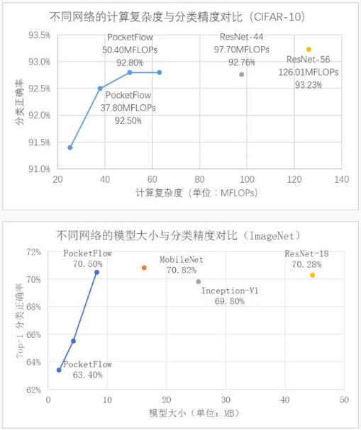 在 CIFAR-10 數(shù)據(jù)集上,PocketFlow 以 ResNet-56 作為基準(zhǔn)模型進(jìn)行通道剪枝,并加入了超參數(shù)優(yōu)化和網(wǎng)絡(luò)蒸餾等訓(xùn)練策略,實(shí)現(xiàn)了 2.5 倍加速下分類精度損失 0.4%,3.3 倍加速下精度損失 0.7%,且顯著優(yōu)于未壓縮的 ResNet-44 模型; 在 ImageNet 數(shù)據(jù)集上,PocketFlow 可以對原本已經(jīng)十分精簡的 MobileNet 模型繼續(xù)進(jìn)行權(quán)重稀疏化,以更小的模型尺寸取得相似的分類精度;與 Inception-V1、ResNet-18 等模型相比,模型大小僅為后者的約 20~40%,但分類精度基本一致(甚至更高)。