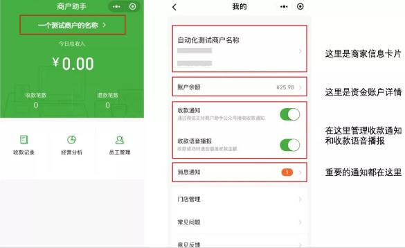 1、點(diǎn)擊商戶名稱進(jìn)入“我的”頁(yè)面:商家信息、資金賬戶詳情、收款通知和語(yǔ)音播報(bào)、最新消息等內(nèi)容一應(yīng)俱全。