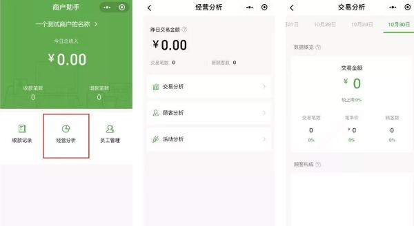 3、經(jīng)營(yíng)分析:商家可在此查看交易分析,顧客分析,活動(dòng)分析等數(shù)據(jù)信息,全方位了解經(jīng)營(yíng)現(xiàn)狀(經(jīng)營(yíng)數(shù)據(jù)會(huì)在每天早上8:00前更新展示)。