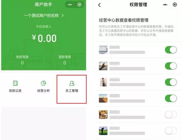 4、員工管理:超級(jí)管理員可以在此一鍵為其他員工開通查看經(jīng)營(yíng)中心數(shù)據(jù)的權(quán)限(員工賬號(hào)需已在商戶平臺(tái)綁定微信號(hào))。(邯鄲微信開發(fā))