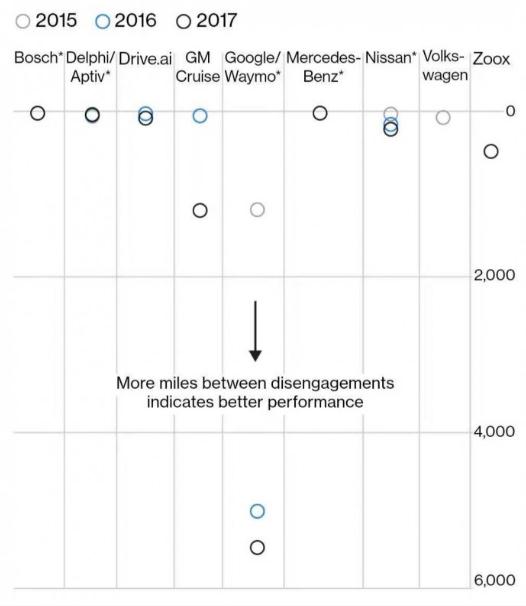在加州測(cè)試自動(dòng)駕駛汽車的公司需要定期上交測(cè)試報(bào)告,結(jié)果顯示,Waymo 確實(shí)大幅領(lǐng)先各路競(jìng)爭(zhēng)對(duì)手,其自動(dòng)駕駛系統(tǒng)的“脫離”頻率比其他公司要低得多。