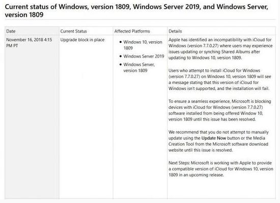 為了確保流暢體驗(yàn),微軟已經(jīng)阻止那些使用 iCloud for Windows(版本 7.7.0.27)的用戶升級(jí) Windows 10 Version 1809。在這個(gè)問題沒有得到徹底解決之前,需要使用 iCloud 服務(wù)的用戶盡量不要手動(dòng)升級(jí)或者使用媒體創(chuàng)作工具完全安裝。