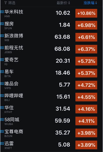 中國概念股多數(shù)上漲,其中漲幅較大的公司包括:華米科技(漲 10.86%)、搜房(漲 6.98%)、新浪微博(漲 6.61%)、前程無憂(漲 6.37%)、愛奇藝(漲 5.73%)、易車(漲 5.37%)、唯品會(漲 4.72%)、嗶哩嗶哩(漲 4.55%)、華住(漲 4.16%)、58 同城(漲 4.11%)、寶尊電商(漲 3.98%)、迅雷(漲 3.89%)、歡聚時代(漲 3.61%)、新浪(漲 3.47%)、陌陌(漲 3.29%)、汽車之家(漲 3.29%)、團車網(wǎng)(漲 3.21%)、瑞思教育(漲 3.18%)。