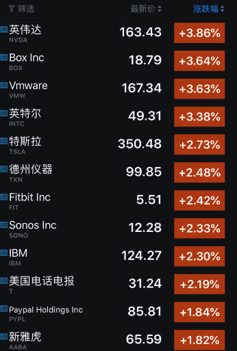 美國科技股多數(shù)上漲,其中漲幅較大的公司包括:英偉達(漲 3.86%)、Box(漲 3.64%)、VMware(漲 3.63%)、英特爾(漲 3.38%)、特斯拉(漲 2.73%)、德州儀器(漲 2.48%)、Fitbit(漲 2.42%)、Sonos(漲 2.33%)、IBM(漲 2.30%)、AT&T(漲 2.19%)。