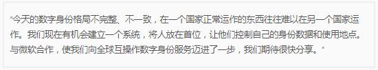 在戰(zhàn)略合作中,微軟和萬事達(dá)卡正在一項服務(wù),該服務(wù)將“允許個人使用他們的個人設(shè)備以他們的方式進(jìn)入,控制和共享他們的身份數(shù)據(jù)”。兩家公司聲稱這將簡化和簡化利用金融,電子商務(wù),政府和數(shù)字服務(wù)的過程。