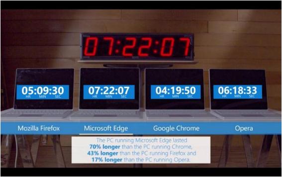 過去兩三年,為了推動用戶使用 Edge 瀏覽器,微軟會在 Windows 10 系統(tǒng)中通過彈窗等各種方式來揶揄 Chrome 瀏覽器。甚至在 2016 年 6 月,微軟甚至專門發(fā)布了一篇報告,將運行在 Windows 10 操作系統(tǒng)上的 Microsoft Edge,Chrome,F(xiàn)irefox 和 Opera 四款瀏覽器的電量損耗情況進行了對比測試,而測試結(jié)果(不出意外地)表明:Microsoft Edge 比 Chrome 等其他瀏覽器更加省電。