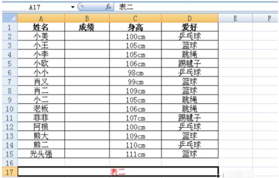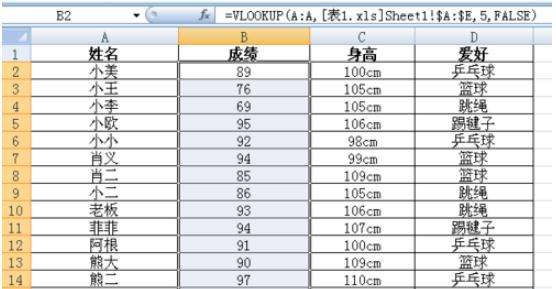 如下圖兩個表格,表一為數(shù)據(jù)量更大的表格包含了表二的部分?jǐn)?shù)據(jù)信息,表二需要從表一中得到指定一部分姓名的成績。使用VLOOKUP函數(shù)前首先要確定表一中姓名是在需要引用的成績所在列的前面。