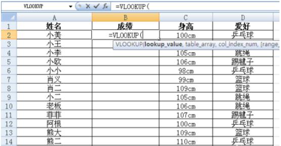 下面開始使用函數(shù)查找,在英文輸入法的狀態(tài)下,在表二需要填充數(shù)據(jù)列“成績”的第一個單元格處輸入“=v”,出現(xiàn)一列函數(shù)后,雙擊選擇VLOOKUP。