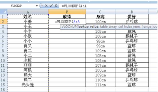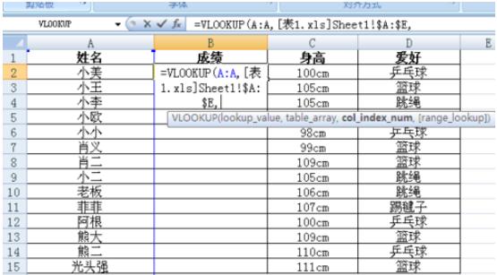 然后選擇你要查找成績的依據(jù)條件列,如表二是根據(jù)姓名來查找成績,所以這里需要選擇表二的姓名所在列作為第一個參數(shù)(如下圖),接著輸入一個逗號。