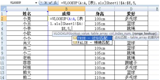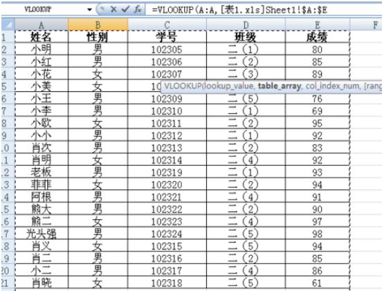 然后在函數(shù)光標(biāo)處再輸入一個數(shù)字作為第三個參數(shù),這個數(shù)字是代表我們要引用數(shù)據(jù)的表一成績欄在我們剛剛所框選的范圍的第幾列,我們這里是第五列,就是輸入“5”,接著再輸入一個逗號(出現(xiàn)下圖),雙擊精準(zhǔn)匹配。