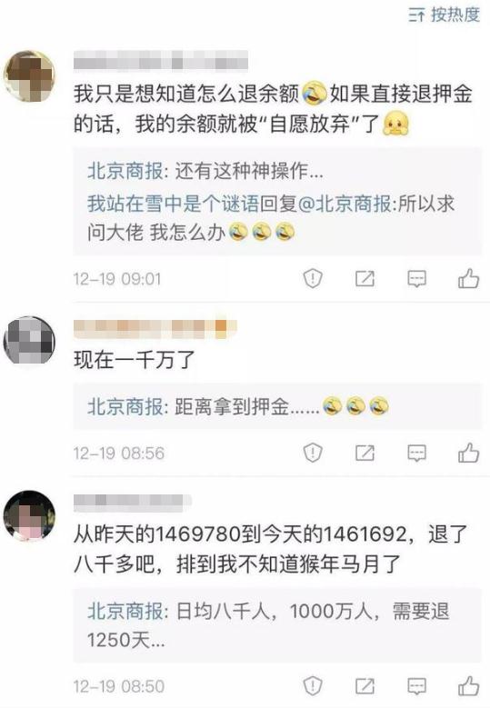 但追問到底最晚什么時(shí)候能退時(shí),工作人員卻表示無法確定,并解釋稱 18 日開始線上排隊(duì)退押金。每天零點(diǎn)都會(huì)退一批人,剩下的人則會(huì)順延到前面。
