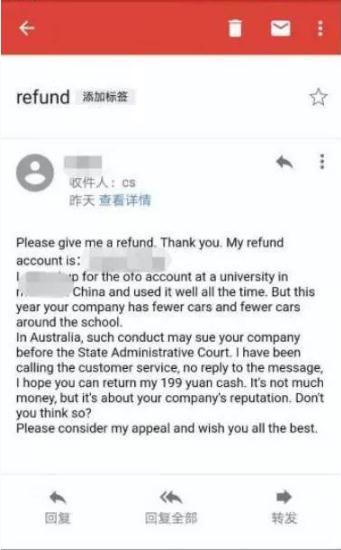 近日,網(wǎng)友@zjt93 發(fā)微博稱,通過假裝是一名來自加州、在中國(guó)生活了兩三年、中文不太好、做事喜歡上綱上線的外國(guó)人,在給 ofo 寫了封投訴郵件后很快收到了退的押金,ofo 還回復(fù)了一封英文郵件道歉。