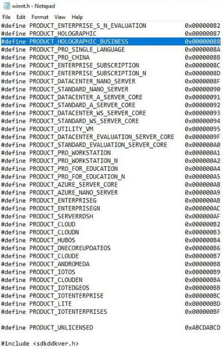 開發(fā)人員在系統(tǒng)定義中發(fā)現(xiàn)了 PRODUCT_HOLOGRAPHIC_BUSINESS,它與 PRODUCT_HOLOGRAPHIC 并列。這是兩個(gè)全新 Windows 10 SKU。