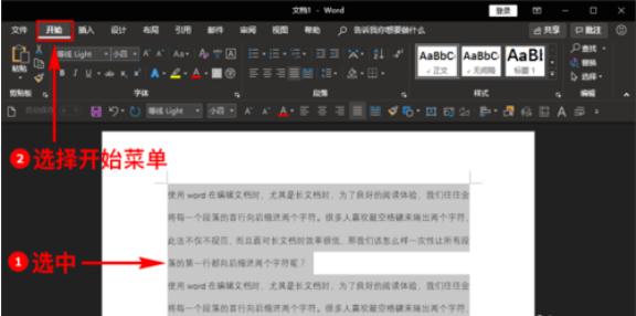 打開后,我們選中文檔中需要第一行向后縮進(jìn)兩個字符的所有文檔,然后在頂部的菜單欄中找到并點(diǎn)擊“開始”菜單。