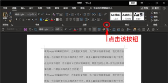 在開始菜單的下拉子菜單中找到“段落”欄目,然后點(diǎn)擊“段落”欄右下角的擴(kuò)展折疊按鈕進(jìn)入。