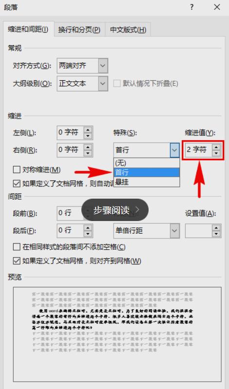 在“縮進(jìn)”欄目組里我們找到“特殊”選項(xiàng),將特殊設(shè)置為“首行”,然后將后面的“縮進(jìn)值”設(shè)置為“2字符”。
