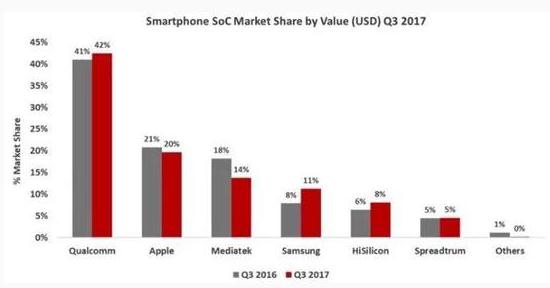 根據(jù)第三方數(shù)據(jù),截至 2017 年第三季度,高通的市場占有率已達到 42%,這甚至超過第二名蘋果(20%)、第三名聯(lián)發(fā)科(14%)的總和。