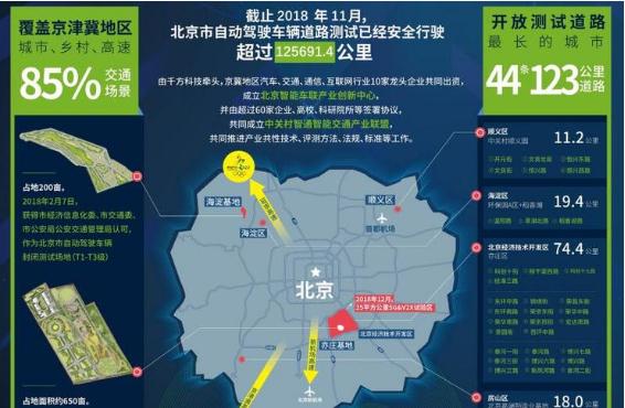 截至 2018 年 11 月,北京自動(dòng)駕駛車輛道路測(cè)試已經(jīng)安全行駛超過(guò) 12.56 萬(wàn)公里,開(kāi)放了 44 條共 123 公里測(cè)試道路,覆蓋京津冀地區(qū)城市、鄉(xiāng)村、高速等 85% 交通場(chǎng)景。其中位于北京亦莊的測(cè)試道路達(dá)到 74.4 公里,成為目前國(guó)內(nèi)最長(zhǎng)的自動(dòng)駕駛測(cè)試道路。