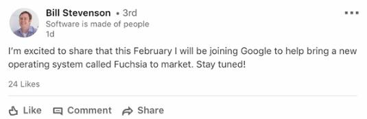 據(jù)外媒報道,谷歌已經(jīng)聘請了有著 14 年經(jīng)驗的資深工程師 Bill Stevenson 來操盤 Fuchsia,目標是推向成熟市場。