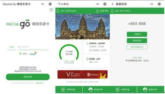 臨近 2019 春節(jié)出行高峰,柬埔寨微信樂(lè)游卡正式發(fā)布。此次微信與柬埔寨運(yùn)營(yíng)商 Smart 合作,助力境外游通訊服務(wù)。為赴柬埔寨的中國(guó)游客提供高速穩(wěn)定的電話網(wǎng)絡(luò)數(shù)據(jù)服務(wù),以及基于微信小程序和微信支付提供全新的電信服務(wù)體驗(yàn)。