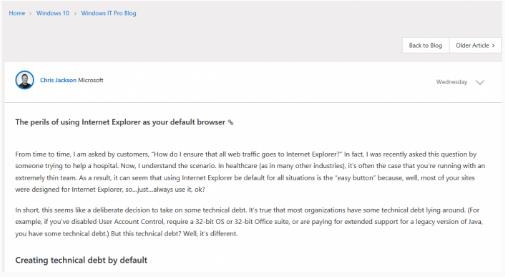 四年前微軟已經(jīng)放棄InternetExplorer品牌,在Windows10平臺上啟用全新的Edge瀏覽器試圖挑戰(zhàn)Chrome和Firefox的市場地位。盡管出于業(yè)務(wù)兼容性等方面的考量部分企業(yè)仍在IE瀏覽器,但它臃腫、過時的代碼并不支持諸多Web新標準。隸屬于微軟Windows部門的網(wǎng)絡(luò)安全專家克里斯·杰克遜(ChrisJackson)近日發(fā)表了名為“使用IE作為默認瀏覽器的風(fēng)險”文章,推薦更多用戶升級至Edge上。