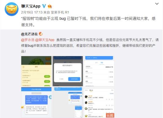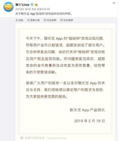 隨后,聊天寶 App 官方微博發(fā)布聲明,稱聊天寶 App 的“搖錢樹”游戲出現(xiàn)問題,導(dǎo)致用戶金幣計數(shù)錯誤,超額發(fā)放給了部分用戶。為及時修復(fù)此問題,當(dāng)前已關(guān)閉“搖錢樹”游戲功能及用戶現(xiàn)金提現(xiàn)功能。待問題修復(fù)完成后,超額發(fā)放的金幣數(shù)量將自動恢復(fù)為原有數(shù)量。