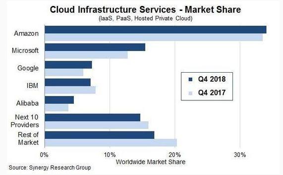 但是從市場份額來看,Google 并沒有取得亮眼的突破。從 Synergy Research Group 最新發(fā)布的 2018 Q4 全球云基礎(chǔ)設(shè)施服務(wù)市場(Iaas,Paas,托管私有云)份額來看,亞馬遜和微軟兩位頭部玩家各占據(jù) 34% 和 15% 的市場份額,Google 只分得 7%。2018 Q3,Google 排在 IBM 之后。在 IDC 日前公布的 2018 年上半年全球公有云 Iaas 市場份額數(shù)據(jù),排名順序?yàn)閬嗰R遜、微軟、阿里云、IBM 和 Google。