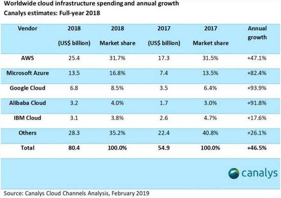 Synergy Research Group 的數(shù)據(jù)顯示,全球 Q4 云基礎(chǔ)設(shè)施服務(wù)支出整體比上一年同期增長了 45 %,2018 年全年增長率為 48 %。根據(jù) Canalys 發(fā)布的全球云基礎(chǔ)設(shè)施支出和年增長率的數(shù)據(jù)顯示,Google 不惜大刀闊斧搶占市場,2018 年 Google 云基礎(chǔ)設(shè)施支出為 68 億美元排名第三,但是年支出增長率最高遠(yuǎn)超亞馬遜和微軟。