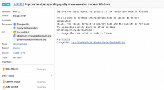 根據(jù)微軟工程師的建議,Chromium 的貢獻(xiàn)者 Maggie Chen 現(xiàn)在提交了一份解決此問題的提交,并且可能會在未來的版本中推送到 Chrome 瀏覽器。Chen 在 Commit 中表示:“在調(diào)用 SetBitmapInterpolationMode 將過濾模式更改為 linear 之后,低分辨率模式的視頻質(zhì)量得到改善。目前相關(guān)的代碼尚未進(jìn)行審核。”