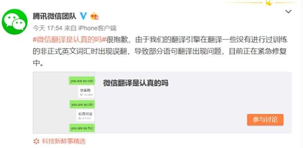 針對此情況,騰訊微信團(tuán)隊(duì)官方微博發(fā)布聲明稱:“這是由于我們的翻譯引擎在翻譯一些沒有進(jìn)行過訓(xùn)練的非正式英文詞匯時(shí)出現(xiàn)誤翻,導(dǎo)致部分語句翻譯出現(xiàn)問題,目前正在緊急修復(fù)中。”