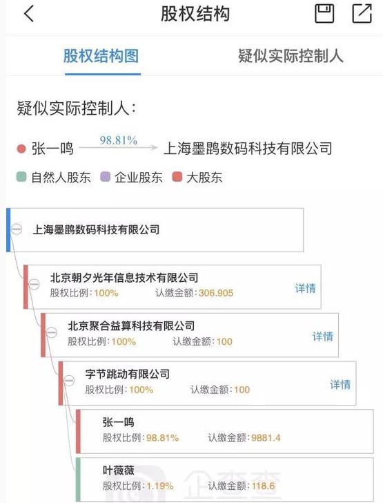 該公司在企查查的更新消息顯示,目前上海墨鹍數(shù)碼科技有限公司(下文稱“上海墨鹍”)的法定代表人已改為今日頭條的高級(jí)副總裁張利東。從上海墨鹍現(xiàn)有的股權(quán)結(jié)構(gòu)來(lái)看,字節(jié)跳動(dòng)有限公司已經(jīng)成為上海墨鹍的控股公司。