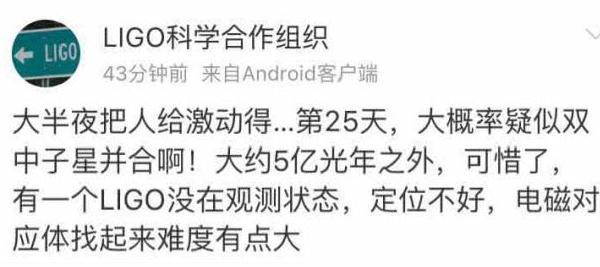 據(jù)“LIGO 科學(xué)合作組織”微博透露,科學(xué)家大概率再次探測(cè)到雙中子星碰撞產(chǎn)生的引力波,這次波源距離地球 5 億光年。另外,我們?cè)儐?wèn)了引力波領(lǐng)域的一線科學(xué)家,都表示探測(cè)到了這樣一個(gè)引力波事件,但對(duì)于波源的具體參數(shù)都還沒(méi)有得到細(xì)節(jié)信息。