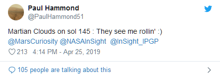 或許有些時(shí)候花點(diǎn)時(shí)間欣賞一下天空中翻滾的云朵是一件非常美好的事情,特別是在火星。本周,NASA 的洞察號(hào)探測器就拍攝到了一些來自火星的云團(tuán)照。而以處理 NASA 火星照出名的公民科學(xué)家 Paul Hammond 就又通過洞察號(hào)傳回來的圖像為人們制作了一個(gè)火星翻滾云朵的動(dòng)態(tài)圖。