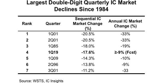 更悲觀的是,1984 年以來,芯片行業(yè)如果第一季度跌幅超過 10%,則全年都會(huì)下跌至少9%,IC Insights 認(rèn)為今年也不會(huì)例外。