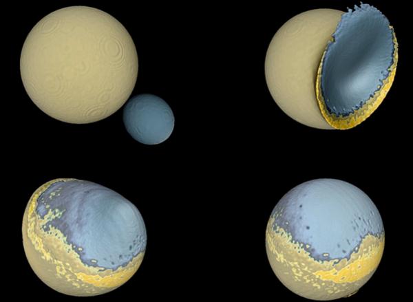 圖說(shuō):月球是如何形成的:模擬的原始月球和另一顆地球衛(wèi)星之間的碰撞顯示,碰撞后二者質(zhì)量嵌合在一起,產(chǎn)生了不對(duì)稱(chēng)的半球。淺藍(lán)色表示月球地殼、深藍(lán)色為月球地幔,黃色為一層上地幔物質(zhì),代表了熔巖組成的“海洋”。另一顆衛(wèi)星的大部分都以薄層堆積起來(lái),形成了類(lèi)似月球背面高地的山區(qū)。