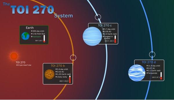 在審查數(shù)據(jù)后,天文學(xué)家得出的結(jié)論是,三顆系外行星正在圍繞附近的恒星 TOI 270 進行軌道運動,因為它是 TESS 自開始科學(xué)運作以來已經(jīng)確定的第 270 個感興趣的天體。