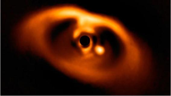 圖說:這是天文學(xué)家第一次捕捉到行星正在形成時(shí)的畫面。圖片中心故意用黑色擋住的部分就是 PDS 70 恒星,其右側(cè)的亮點(diǎn)就是 PDS 70b 行星。天文學(xué)家不久前發(fā)現(xiàn)了圍繞 PDS 70 運(yùn)行的第二顆“嬰兒”行星