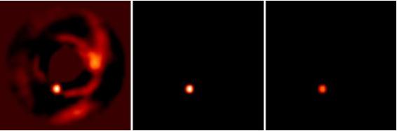 圖說:PDS 70b 行星的紅外圖像(左)看起來更像是具有一個(gè)環(huán)繞其運(yùn)行的圓盤(中),而不是單單一顆行星(右)