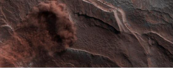 “每年春天,太陽照射在火星北極層疊層的一側(cè),其被稱為北極層狀沉積物,” 行星科學(xué)家 Candy Hansen 寫道。“暖和使冰塊變得不穩(wěn)定并開始松動。”